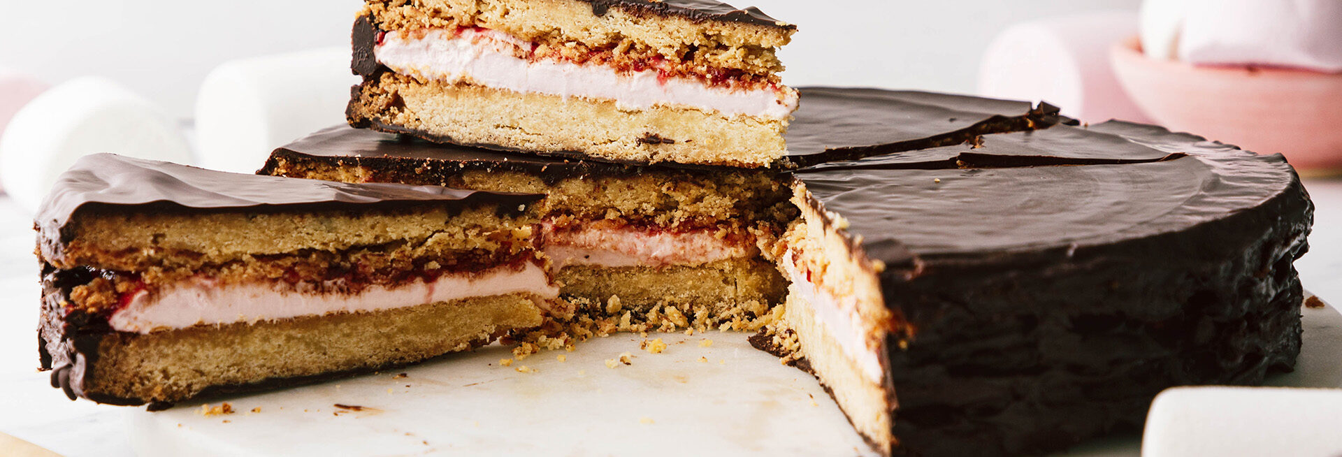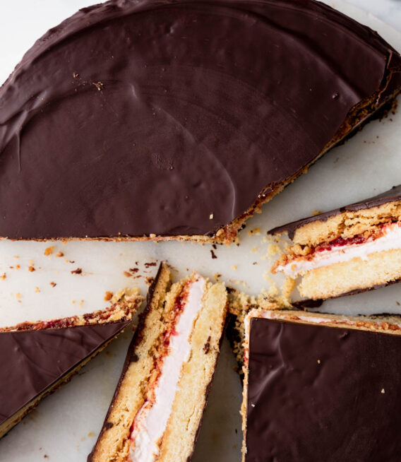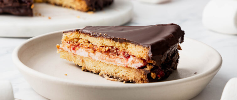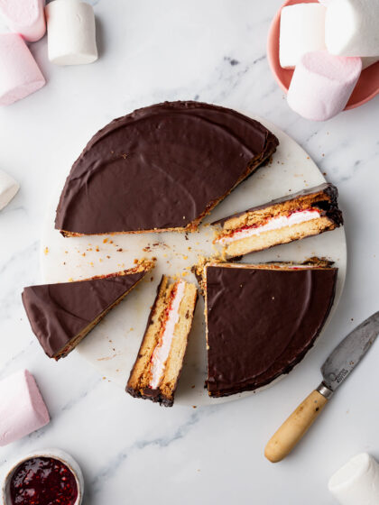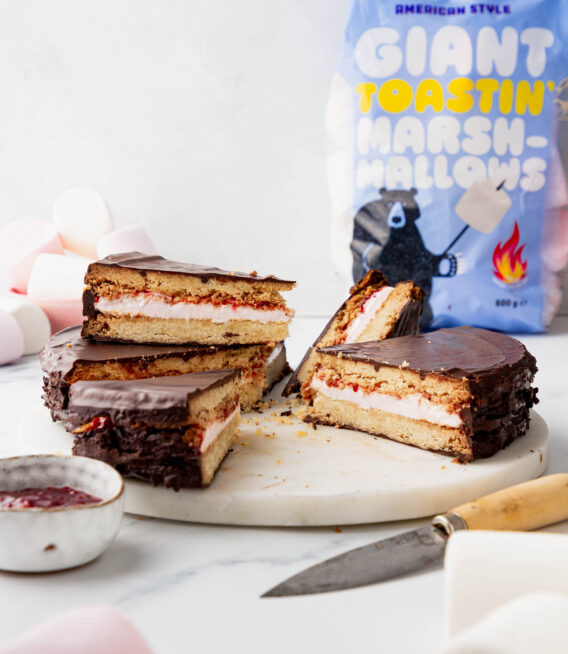 Throwback to a childhood classic, but make it EPIC! This supersized Giant Wagon Wheel is the perfect party dessert. Filled with a layer of gooey Giant Toastin’ Marshmallow fluff and jam, sandwiched between two giant crunchy biscuits and coated in smooth dark chocolate. Just slice and serve!