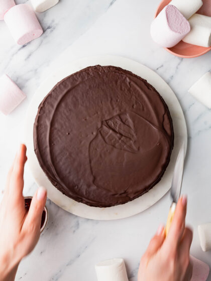 Take your wagon wheel out of the fridge and place it on a wire rack with a baking tray underneath it. Pour the chocolate over and spread it evenly across the top with a palette knife, allowing it to dribble over the side. Spread the chocolate around the edge until the wagon wheel is completely covered, letting any excess drip through the wire rack.