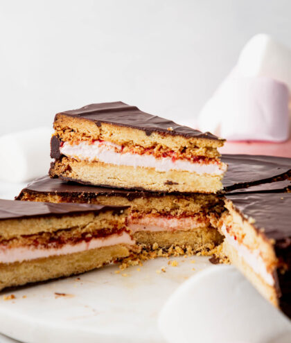Scrape the melted mallow out of the bowl and onto the biscuit base, then using a palette knife to spread it to the edges. Add the jam and spread it over the marshmallow evenly. Place the other biscuit on top, press down gently to sandwich everything together nicely, then chill in the fridge for 15 minutes to firm up.