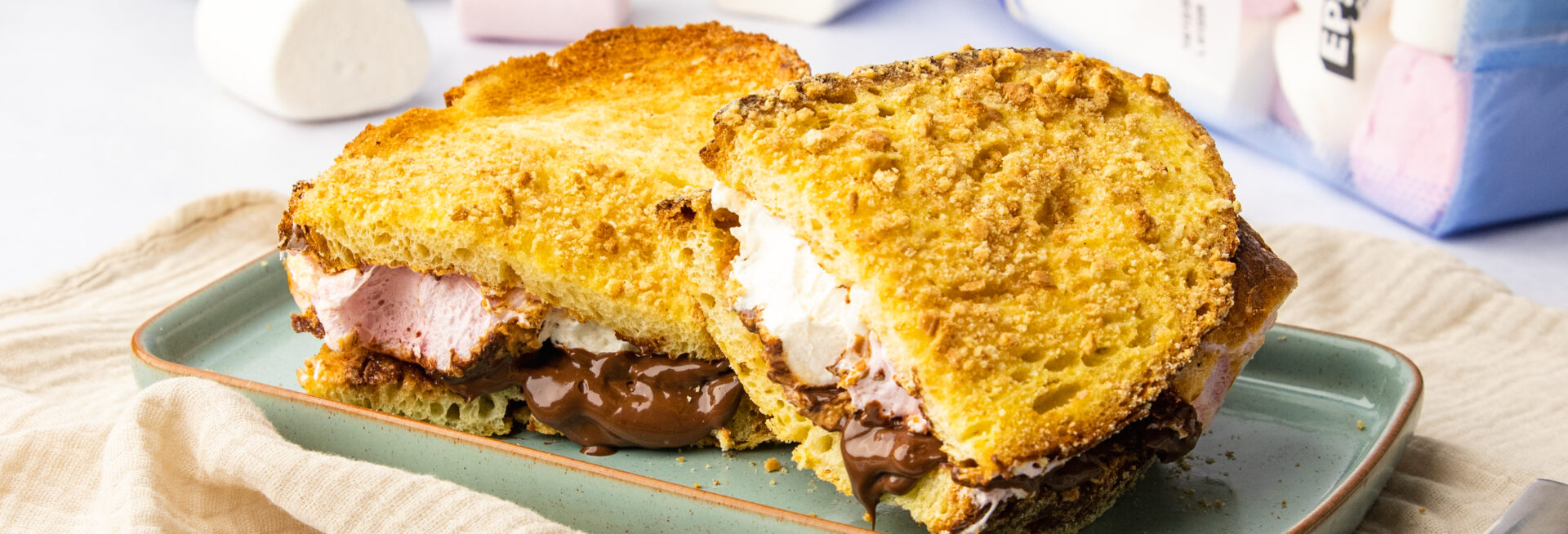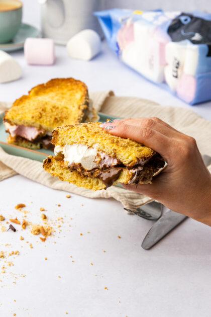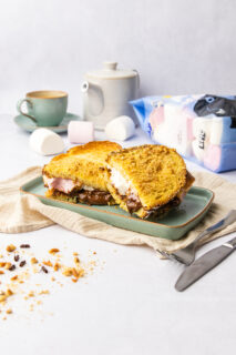 French toast with an EPIC twist! This indulgent S’mores French Toast recipe features two thick slices of bread coated in biscuit crumbs, then filled with our melted Sticky Toffee chocolate and gooey Giant Toastin’ Marshmallows to create a truly EPIC breakfast.